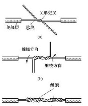 先將兩導(dǎo)線的芯線線頭作X形交叉,再將它們相互纏繞2~3圈后扳直兩線頭,然后將每個(gè)線頭在另一芯線上緊貼密繞5~6圈后剪去多余線頭即可。