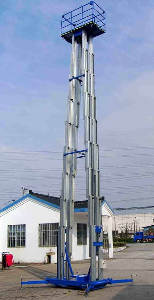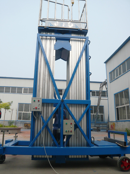 鋁合金液壓升降機(jī)且耗電少、無污染、工作時不傷地面,可用于貼墻工作及探出作業(yè),工作無死角。鋁合金液壓升降機(jī)廣泛適用于星級酒店,大型超市等各行業(yè)大廳、廠房內(nèi)的高空清潔和電線、照明安裝維護(hù)類高空作業(yè),鋁合金液壓升降機(jī)根據(jù)其自身升高度可分為:單桅柱式升降機(jī)(4-10米),雙桅柱式升降機(jī)(8-14米)跟多桅柱式升降機(jī)(12-22米)。